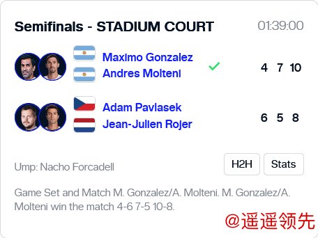 在率先进行的第二场男双半决赛中,阿根廷组合冈萨雷斯/莫尔泰尼用时1小时39分钟,在先输一盘的情况下,连扳两盘,以4-6/7-5/10-8逆转跨国组合帕夫拉塞克/罗约尔,晋级决赛,将与跨国组合科霍夫/梅克蒂奇争冠。
