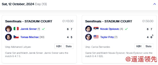 这样,4号种子德约科维奇用时1小时56分钟,连胜两盘,以6-4/7-6(6)战胜7号种子弗里茨,在赢得对对手10连胜的同时,也是第59次闯入大师赛决赛,将冲击生涯100冠。